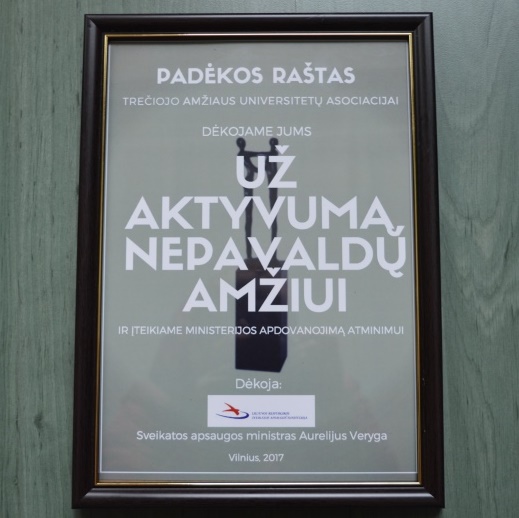 Nacionalinei trečiojo amžiaus universitetų asociacijai įteiktas Sveikatos apsaugos ministerijos apdovanojimas „Už aktyvumą, nepavaldų amžiui“