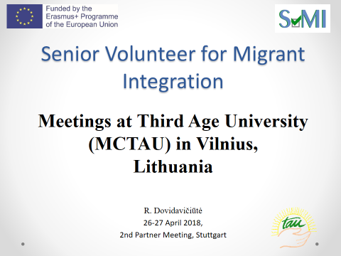 2018 m. balandžio 26-27 d. tarptautinio projekto „Senjorai savanoriai migrantų integracijai“ (SVMI) partneriai iš Lietuvos, Vokietijos, Graikijos, Suomijos ir Prancūzijos susirinko į antrąjį projekto susitikimą Štutgarte, kur aptarė įvykdytas veiklas ir numatė kitus projekto žingsnius.